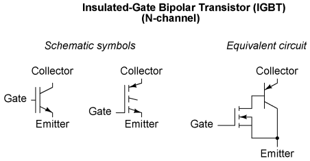 Unfortunately, though, IGFETs have problems of their own controlling high current: they typically exhibit greater drain-to-source voltage drop while saturated than the collector-to-emitter voltage drop of a saturated BJT. This greater voltage drop equates to higher power dissipation for the same amount of load current, limiting the usefulness of IGFETs as high-power devices. Although some specialized designs such as the so-called VMOS transistor have been designed to minimize this inherent disadvantage, the bipolar junction transistor is still superior in its ability to switch high currents. IGBT Insulated-Gate Bipolar Transistor IGT Insulated-Gate Transistor COMFET Conductivity-Modulated Field-Effect Transistor Bipolar-mode MOSFETAn interesting solution to this dilemma leverages the best features of IGFETs with the best of features of BJTs, in one device called an Insulated-Gate Bipolar Transistor, or IGBT. Also known as an Bipolar-mode MOSFET, a Conductivity-Modulated Field-Effect Transistor (COMFET), or simply as an Insulated-Gate Transistor (IGT), it is equivalent to a Darlington pair of IGFET and BJT: