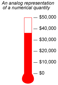 Different types of numbers find different application in the physical world. Whole numbers work well for counting discrete objects, such as the number of resistors in a circuit. Integers are needed when negative equivalents of whole numbers are required. Irrational numbers are numbers that cannot be exactly expressed as the ratio of two integers, and the ratio of a perfect circle's circumference to its diameter (π) is a good physical example of this. The non-integer quantities of voltage, current, and resistance that we're used to dealing with in DC circuits can be expressed as real numbers, in either fractional or decimal form. For AC circuit analysis, however, real numbers fail to capture the dual essence of magnitude and phase angle, and so we turn to the use of complex numbers in either rectangular or polar form. If we are to use numbers to understand processes in the physical world, make scientific predictions, or balance our checkbooks, we must have a way of symbolically denoting them. In other words, we may know how much money we have in our checking account, but to keep record of it we need to have some system worked out to symbolize that quantity on paper, or in some other kind of form for record-keeping and tracking. There are two basic ways we can do this: analog and digital. With analog representation, the quantity is symbolized in a way that is infinitely divisible. With digital representation, the quantity is symbolized in a way that is discretely packaged. You're probably already familiar with an analog representation of money, and didn't realize it for what it was. Have you ever seen a fund-raising poster made with a picture of a thermometer on it, where the height of the red column indicated the amount of money collected for the cause? The more money collected, the taller the column of red ink on the poster.