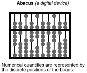 Unlike the "thermometer" poster with its red column, those symbolic characters above cannot be finely divided: that particular combination of ciphers stand for one quantity and one quantity only. If more money is added to the account (+ $40.12), different symbols must be used to represent the new balance ($35,995.50), or at least the same symbols arranged in different patterns. This is an example of digital representation. The counterpart to the slide rule (analog) is also a digital device: the abacus, with beads that are moved back and forth on rods to symbolize numerical quantities: