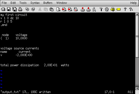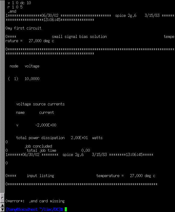 my first circuit v 1 0 dc 10 r 1 0 5 .end node voltage ( 1) 10.0000 voltage source currents name current v -2.000E+00 total power dissipation 2.00E+01 watts Incidentally, this is the preferred format for text output from SPICE simulations in this book series: as real text, not as graphic screenshot images.
