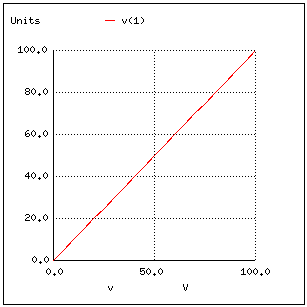 If I re-edit the netlist file, changing the Legend: + = v#branch ------------------------------------------------------------------------ sweep v#branch-2.00e+01 -1.00e+01 0.00e+00 ---------------------|------------------------|------------------------| 0.000e+00 0.000e+00 . . + 5.000e+00 -1.000e+00 . . + . 1.000e+01 -2.000e+00 . . + . 1.500e+01 -3.000e+00 . . + . 2.000e+01 -4.000e+00 . . + . 2.500e+01 -5.000e+00 . . + . 3.000e+01 -6.000e+00 . . + . 3.500e+01 -7.000e+00 . . + . 4.000e+01 -8.000e+00 . . + . 4.500e+01 -9.000e+00 . . + . 5.000e+01 -1.000e+01 . + . 5.500e+01 -1.100e+01 . + . . 6.000e+01 -1.200e+01 . + . . 6.500e+01 -1.300e+01 . + . . 7.000e+01 -1.400e+01 . + . . 7.500e+01 -1.500e+01 . + . . 8.000e+01 -1.600e+01 . + . . 8.500e+01 -1.700e+01 . + . . 9.000e+01 -1.800e+01 . + . . 9.500e+01 -1.900e+01 . + . . 1.000e+02 -2.000e+01 + . . ---------------------|------------------------|------------------------| sweep v#branch-2.00e+01 -1.00e+01 0.00e+00 In both output formats, the left-hand column of numbers represents the battery voltage at each interval, as it increases from 0 volts to 100 volts, 5 volts at a time. The numbers in the right-hand column indicate the circuit current for each of those voltages. Look closely at those numbers and you'll see the proportional relationship between each pair: Ohm's Law (I=E/R) holds true in each and every case, each current value being 1/5 the respective voltage value, because the circuit resistance is exactly 5 Ω. Again, the negative numbers for current in this SPICE analysis is more of a quirk than anything else. Just pay attention to the absolute value of each number unless otherwise specified. There are even some computer programs able to interpret and convert the non-graphical data output by SPICE into a graphical plot. One of these programs is called Nutmeg, and its output looks something like this: