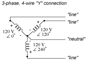 The three conductors leading away from the voltage sources (windings) toward a load are typically called lines, while the windings themselves are typically called phases. In a Y-connected system, there may or may not be a neutral wire attached at the junction point in the middle, although it certainly helps alleviate potential problems should one element of a three-phase load fail open, as discussed earlier: