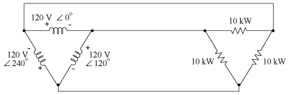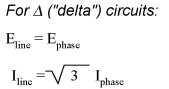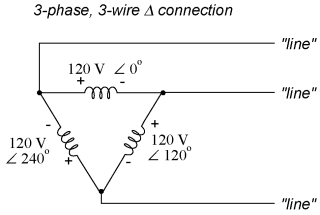 Sure enough, there will be zero voltage across the break, telling us that no current will circulate within the triangular loop of windings when that connection is made complete. Having established that a Δ-connected three-phase voltage source will not burn itself to a crisp due to circulating currents, we turn to its practical use as a source of power in three-phase circuits. Because each pair of line conductors is connected directly across a single winding in a Δ circuit, the line voltage will be equal to the phase voltage. Conversely, because each line conductor attaches at a node between two windings, the line current will be the vector sum of the two joining phase currents. Not surprisingly, the resulting equations for a Δ configuration are as follows: