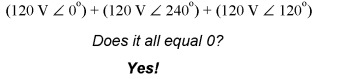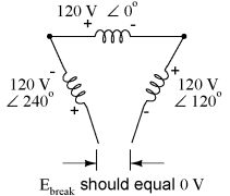 Indeed, if we add these three vector quantities together, they do add up to zero. Another way to verify the fact that these three voltage sources can be connected together in a loop without resulting in circulating currents is to open up the loop at one junction point and calculate voltage across the break: