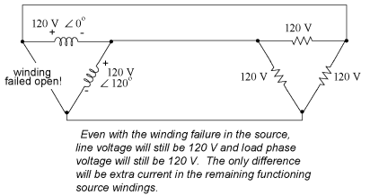 The only consequence of a source winding failing open for a Δ-connected source is increased phase current in the remaining windings. Compare this fault tolerance with a Y-connected system suffering an open source winding: