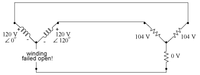 With a Δ-connected load, two of the resistances suffer reduced voltage while one remains at the original line voltage, 208. A Y-connected load suffers an even worse fate with the same winding failure in a Y-connected source: