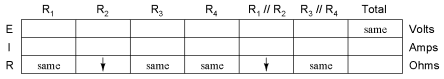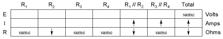 But how do we apply the same Ohm's Law formula (E=IR) to the R1//R2 column, where we have resistance decreasing and current increasing? It's easy to determine if only one variable is changing, as it was with R3//R4, but with two variables moving around and no definite numbers to work with, Ohm's Law isn't going to be much help. However, there is another rule we can apply horizontally to determine what happens to the voltage across R1//R2: the rule for voltage in series circuits. If the voltages across R1//R2 and R3//R4 add up to equal the total (battery) voltage and we know that the R3//R4 voltage has increased while total voltage has stayed the same, then the voltage across R1//R2 must have decreased with the change of R2's resistance value:
