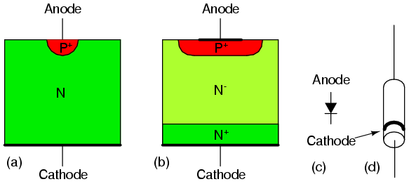 Junction diodesThere were some historic crude, but useable semiconductor rectifiers before high purity materials were available. Ferdinand Braun invented a lead sulfide, PbS, based point contact rectifier in 1874. Cuprous oxide rectifiers were used as power rectifiers in 1924. The forward voltage drop is 0.2 V. The linear characteristic curve perhaps is why Cu2O was used as a rectifier for the AC scale on D'Arsonval based multimeters. This diode is also photosensitive. Selenium oxide rectifiers were used before modern power diode rectifiers became available. This and the Cu2O rectifiers were polycrystalline devices. Photoelectric cells were once made from Selenium. Before the modern semiconductor era, an early diode application was as a radio frequency detector, which recovered audio from a radio signal. The “semiconductor” was a polycrystalline piece of the mineral galena, lead sulfide, PbS. A pointed metallic wire known as a cat whisker was brought in contact with a spot on a crystal within the polycrystalline mineral. (Figure below) The operator labored to find a “sensitive” spot on the galena by moving the cat whisker about. Presumably there were P and N-type spots randomly distributed throughout the crystal due to the variability of uncontrolled impurities. Less often the mineral iron pyrites, fools gold, was used, as was the mineral carborundum, silicon carbide, SiC.. Another detector, part of a foxhole radio, consisted of a sharpened pencil lead bound to a bent safety pin, touching a rusty blue-blade disposable razor blade. These all required searching for a sensitive spot, easily lost because of vibration. Crystal detector Replacing the mineral with an N-doped semiconductor (Figure below(a) ) makes the whole surface sensitive, so that searching for a sensitive spot was no longer required. This device was perfected by G.W.Pickard in 1906. The pointed metal contact produced a localized P-type region within the semiconductor. The metal point was fixed in place, and the whole point contact diode encapsulated in a cylindrical body for mechanical and electrical stability. (Figure below(d) ) Note that the cathode bar on the schematic corresponds to the bar on the physical package. Silicon point contact diodes made an important contribution to radar in World War II, detecting giga-hertz radio frequency echo signals in the radar receiver.. The concept to be made clear is that the point contact diode preceded the junction diode and modern semiconductors by several decades. Even to this day, the point contact diode is a practical means of microwave frequency detection because of its low capacitance. Germanium point contact diodes were once more readily available than they are today, being preferred for the lower 0.2 V forward voltage in some applications like self-powered crystal radios. Point contact diodes, though sensitive to a wide bandwidth,, have a low current capability compared with junction diodes.. Silicon diode cross-section: (a) point contact diode, (b) junction diode, (c) schematic symbol, (d) small signal diode package. Most diodes today are silicon junction diodes. The cross-section in Figure above looks a bit more complex than a simple PN junction; though, it is still a PN junction. Starting at the cathode connection, the N+ indicates this region is heavily doped, having nothing to do with polarity. This reduces the series resistance of the diode. The N- region is lightly doped as indicated by the (-). Light doping produces a diode with a higher reverse breakdown voltage, important for high voltage power rectifier diodes. Lower voltage diodes, even low voltage power rectifiers, would have lower forward losses with heavier doping. The heaviest level of doping produce zener diodes designed for a low reverse breakdown voltage. However, heavy doping increases the reverse leakage current. The P+ region at the anode contact is heavily doped P-type semiconductor, a good contact strategy. Glass encapsulate small signal junction diodes are capable of 10's to 100's of mA of current. Plastic or ceramic encapsulated power rectifier diodes handle to 1000's of amperes of current.