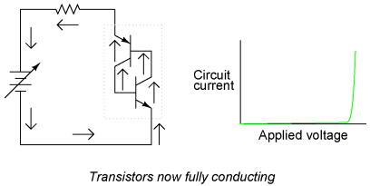 The Shockley Diodefour-layer diode 4-layer diode PNPN diode Shockley diode diodeOur exploration of thyristors begins with a device called the four-layer diode, also known as a PNPN diode, or a Shockley diode after its inventor, William Shockley. This is not to be confused with a Schottky diode, that two-layer metal-semiconductor device known for its high switching speed. A crude illustration of the Shockley diode, often seen in textbooks, is a four-layer sandwich of P-N-P-N semiconductor material: Unfortunately, this simple illustration does nothing to enlighten the viewer on how it works or why. Consider an alternative rendering of the device's construction: Shown like this, it appears to be a set of interconnected bipolar transistors, one PNP and the other NPN. Drawn using standard schematic symbols, and respecting the layer doping concentrations not shown in the last image, the Shockley diode looks like this: Let's connect one of these devices to a source of variable voltage and see what happens: With no voltage applied, of course there will be no current. As voltage is initially increased, there will still be no current because neither transistor is able to turn on: both will be in cutoff mode. To understand why this is, consider what it takes to turn a bipolar junction transistor on: current through the base-emitter junction. As you can see in the diagram, base current through the lower transistor is controlled by the upper transistor, and the base current through the upper transistor is controlled by the lower transistor. In other words, neither transistor can turn on until the other transistor turns on. What we have here, in vernacular terms, is known as a Catch-22. So how can a Shockley diode ever conduct current, if its constituent transistors stubbornly maintain themselves in a state of cutoff? The answer lies in the behavior of real transistors as opposed to ideal transistors. An ideal bipolar transistor will never conduct collector current if there is no base current, no matter how much or little voltage we apply between collector and emitter. Real transistors, on the other hand, have definite limits to how much collector-emitter voltage they can withstand before they break down and conduct. If two real transistors are connected together in this fashion to form a Shockley diode, they will be able to conduct if there is sufficient voltage applied by the battery between anode and cathode to cause one of them to break down. Once one transistor breaks down and begins to conduct, it will allow base current through the other transistor, causing it to turn on in a normal fashion, which then allows base current through the first transistor. The end result is that both transistors will be saturated, now keeping each other turned on instead of off. So, we can force a Shockley diode to turn on by applying sufficient voltage between anode and cathode. As we have seen, this will inevitably cause one of the transistors to turn on, which then turns the other transistor on, ultimately "latching" both transistors on where they will tend to remain. But how do we now get the two transistors to turn off again? Even if the applied voltage is reduced to a point well below what it took to get the Shockley diode conducting, it will remain conducting because both transistors now have base current to maintain regular, controlled conduction. The answer to this is to reduce the applied voltage to a much lower point where there is too little current to maintain transistor bias, at which point one of the transistors will cutoff, which then halts base current through the other transistor, sealing both transistors in the "off" state as they were before any voltage was applied at all. If we graph this sequence of events and plot the results on an I/V graph, the hysteresis is very evident. First, we will observe the circuit as the DC voltage source (battery) is set to zero voltage: Next, we will steadily increase the DC voltage. Current through the circuit is at or nearly at zero, as the breakdown limit has not been reached for either transistor: When the voltage breakdown limit of one transistor is reached, it will begin to conduct collector current even though no base current has gone through it yet. Normally, this sort of treatment would destroy a bipolar junction transistor, but the PNP junctions comprising a Shockley diode are engineered to take this kind of abuse, similar to the way a Zener diode is built to handle reverse breakdown without sustaining damage. For the sake of illustration I'll assume the lower transistor breaks down first, sending current through the base of the upper transistor: As the upper transistor receives base current, it turns on as expected. This action allows the lower transistor to conduct normally, the two transistors "sealing" themselves in the "on" state. Full current is very quickly seen in the circuit: The positive feedback mentioned earlier in this chapter is clearly evident here. When one transistor breaks down, it allows current through the device structure. This current may be viewed as the "output" signal of the device. Once an output current is established, it works to hold both transistors in saturation, thus ensuring the continuation of a substantial output current. In other words, an output current "feeds back" positively to the input (transistor base current) to keep both transistors in the "on" state, thus reinforcing (or regenerating) itself. With both transistors maintained in a state of saturation with the presence of ample base current, they will continue to conduct even if the applied voltage is greatly reduced from the breakdown level. The effect of positive feedback is to keep both transistors in a state of saturation despite the loss of input stimulus (the original, high voltage needed to break down one transistor and cause a base current through the other transistor): If the DC voltage source is turned down too far, though, the circuit will eventually 