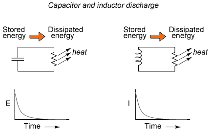 Why L/R and not LR?It is often perplexing to new students of electronics why the time-constant calculation for an inductive circuit is different from that of a capacitive circuit. For a resistor-capacitor circuit, the time constant (in seconds) is calculated from the product (multiplication) of resistance in ohms and capacitance in farads: τ=RC. However, for a resistor-inductor circuit, the time constant is calculated from the quotient (division) of inductance in henrys over the resistance in ohms: τ=L/R. This difference in calculation has a profound impact on the qualitative analysis of transient circuit response. Resistor-capacitor circuits respond quicker with low resistance and slower with high resistance; resistor-inductor circuits are just the opposite, responding quicker with high resistance and slower with low resistance. While capacitive circuits seem to present no intuitive trouble for the new student, inductive circuits tend to make less sense. Key to the understanding of transient circuits is a firm grasp on the concept of energy transfer and the electrical nature of it. Both capacitors and inductors have the ability to store quantities of energy, the capacitor storing energy in the medium of an electric field and the inductor storing energy in the medium of a magnetic field. A capacitor's electrostatic energy storage manifests itself in the tendency to maintain a constant voltage across the terminals. An inductor's electromagnetic energy storage manifests itself in the tendency to maintain a constant current through it. Let's consider what happens to each of these reactive components in a condition of discharge: that is, when energy is being released from the capacitor or inductor to be dissipated in the form of heat by a resistor: