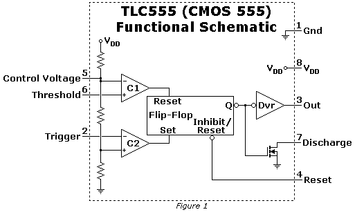 THEORY OF OPERATION An observant reader will note that this is fundamentally the same circuit that was used in the 555 AUDIO OSCILLATOR experiment. Many designs use the same basic designs and concepts several different ways, this is such a case. A conventional 555 IC would work in this design if the power supply weren't so low and a LED current limiting resistor is used. Other than the type of transistors used the block diagram shown in Figure45022.png 1 is basically the same as a conventional 555. This particular oscillator depends on the pin 7 transistor, much like the 555 Monostable Multivibrator shown in an earlier experiment. The startup condition is with the capacitor discharged, the output high, and pin 7 transistor off. The capacitor starts charging as shown in Figure45023.png 2. When the voltage across pins 2 and 6 reaches 2/3 of the power supply the flip flop is reset via internal comparator C1, which turns on the Pin 7 transistor, and starts the capacitor C1 discharging through R2 as shown in Figure45024.png 3. The current shown through R1 is incidental, and not important other than it drains the battery. This is why this resistor value is so large. When the voltage across pins 2 and 6 reaches 1/3 of the power supply the flip flop is set via internal comparator C2, when turns off the pin 7 transistor, allowing the capacitor to start charging again through R1 and R2, as shown in Figure45023.png 2. This cycle repeats. Capacitor C2 extends the life of the batteries, since it will store the voltage during the 97% of time the circuit is off, and provide the current during the 3% it is on. This simple addition will take the batteries beyond their useful life by a large margin. In running this experiment there was a feedback mechanism I hadn't anticipated. The output current of the TLC555 is not proportional, as the power supply voltage goes down the output current reduces a lot more. My flasher lasted for 6 months before I terminated the experiment. It was still flashing, it was just very dim.