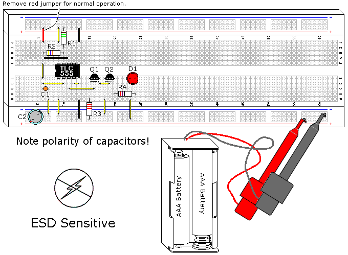 INSTRUCTIONS NOTE! This project uses a static sensitive part, the CMOS 555. If you do not use protection as described in Volume 3, Chapter 9, ElectroStatic Discharge, you run the risk of destroying it. The circuit shown in the previous experiment, CMOS 555 Long Duration Minimum Parts Red LED Flasher, has one big drawback, which is a lack of LED current control. This experiment uses the same basic 555 schematic and adds transistorized drivers to correct this. The parts used for this transistor driver are non critical. It is designed to load the TLC555 to an absolute minimum and still turn on Q2 fully. This is important because as the battery voltage approaches 2V the drive from the TLC555 is reduced to its minimum values. Bipolar transistors can be good switches.