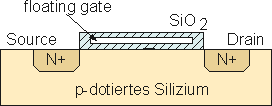 EPROMs (Erasable Programmable Read Only Memory) sind vom Benutzer programmierbare, UV-löschbare Speicher. Nach der Herstellung eines EPROMs sind alle Speicherzellen im gelöschten Zustand (logisch 1) und werden vom Benutzer mit Hilfe von speziellen Programmiergeräten programmiert. Die gespeicherte Information kann durch Bestrahlung mit ultraviolettem Licht, das durch ein Quarzfenster im Gehäuse des Bausteins auf den Chip fällt, wieder gelöscht werden, so dass die EPROMs dann wieder von neuem programmiert werden können. Jede EPROM-Speicherzelle besteht aus einem Transistor, dessen Gate von isolierendem SiO2 vollständig umschlossen ist. Gelingt es nun, auf dieses Gate Ladung zu transferieren, so kann die Ladung nicht wieder abfließen und bleibt sehr lange auf dem Gate erhalten, da das umgebende SiO2 ein sehr guter Isolator ist. Die gespeicherte Ladung erzeugt aber durch Influenz im nahe liegenden Kanal des Transistors eine entgegengesetzte Ladung, wodurch der Transistor leitend wird. Man kann dadurch also feststellen, ob im Gate eine Ladung gespeichert ist, ohne die Ladung selbst zu verändern.