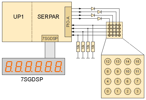Das folgende Experiment soll ein Verfahren zur Ansteuerung einer Tastatur zeigen. Dazu wird eine Tastatur aus 16 Aus-/Ein-Tastern aufgebaut. Die Tasten werden quadratisch in Reihen zu je vier Elementen angeordnet und die entstandene Tastenmatrix wird mit insgesamt acht Leitungen an die PIO angeschlossen. Die PIO wird nun so programmiert, dass vier Leitungen (in diesem Beispiel die horizontalen Leitungen) als Eingänge geschaltet sind und die anderen vier als Ausgänge.