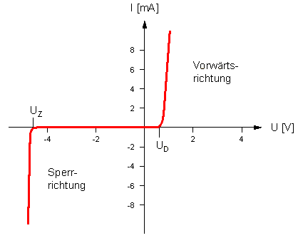 Das Verhalten der Diode wird in einer Kennlinie charakterisiert. In dieser Kennlinie wird der durch die Diode fließende Strom gegen die angelegte Spannung aufgetragen. Man erkennt, dass der Strom in Vorwärtsrichtung nicht bei null Volt zu fließen beginnt, sondern erst bei einer Spannung Ud, der sogenannten Durchlassspannung. Sie hängt vom verwendeten Halbleitermaterial ab, und beträgt für Silizium 0.6 V und für Germanium 0.3 V. Ab dieser Schwelle beginnt der Strom stark zu steigen, die Diode leitet.
