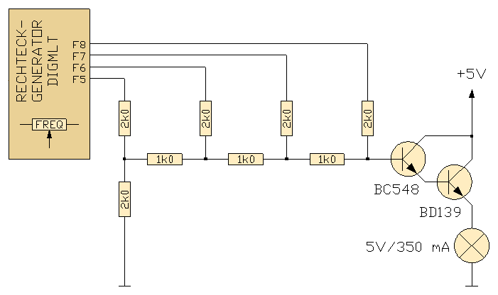 Im folgenden Experiment soll ein 4-Bit-DA-Wandler mit Hilfe einer Widerstandsleiter aufgebaut werden und die erzeugte Analogspannung zur Steuerung einer Glühbirne dienen. Zum Aufbau wird die Platine DIGMLT eingesetzt. Der DA-Wandler wird zyklisch über den auf der Platine vorhandenen Zähler angesteuert, so dass eine sägezahnförmige Ausgangsspannung erzeugt wird. Die Schaltung wird gemäß der folgenden Abbildung aufgebaut. Der einfache DA-Wandler wird an den auf der Platine vorhandenen Zähler angeschlossen (MSB und LSB nicht vertauschen !) und erzeugt eine periodische Sägezahnspannung, die über einen Emitterfolger an eine Taschenlampen-Glühbirne gelegt wird. Die Darlington-Schaltung des Emitterfolgers wird eingesetzt, um eine möglichst geringe Belastung des Widerstandsnetzwerkes zu erreichen. Dies hat allerdings zur Folge, dass erst ab einer Ausgangsspannung von ca. 1.2 V die Glühlampe angesteuert wird. Für höhere Ansprüche müsste man den Emitterfolger mit einem gegengekoppelten Operationsverstärker ansteuern.