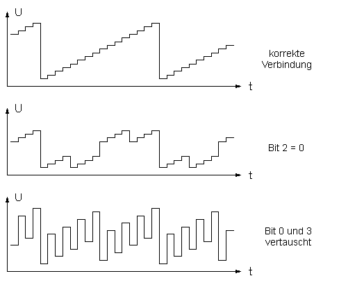 Wenn man die Frequenz des Rechteckgenerators möglichst niedrig einstellt, kann man das Ansteigen der Ausgangsspannung des DA-Wandlers am Anstieg der Helligkeit der Glühbirne verfolgen. Ein etwas anderer Aufbau des Experiments ermöglicht die direkte Einstellung der Helligkeit der Glühbirne über vier Tasten. Dazu werden die Eingänge des DA-Wandlers nicht mit dem Rechteckgenerator verbunden, sondern mit den Ausgängen der auf der Platine DIGMLT vorhandenen elektronischen Schalter. Nun kann man durch Eingabe einer entsprechenden 4-Bit-Kombination die Helligkeit beliebig einstellen. Der Leser sei außerdem dazu angeregt, die Datenleitungen des DA-Wandlers zu vertauschen, oder einzelne Datenleitungen auf Masse zu legen und das Ergebnis am Oszilloskopschirm zu verfolgen. Dazu wird am besten der Frequenzgenerator auf die höchste einstellbare Frequenz gestellt. Folgende Abbildung zeigt die erzeugte Analogspannung bei korrekter Verdrahtung, bei Vertauschung von MSB und LSB und bei Ansteuerung von nur drei Datenleitungen (Bit2=0)