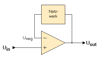 Bei der Gegenkopplung wird ein Teil des Ausgangssignals auf den (-)Eingang zurückgeführt. Die Höhe des rückgeführten Signals wird durch den Kopplungsfaktor k bestimmt. Für die Schaltung gilt, dass die Ausgangsspannung gleich der Differenz der Eingangsspannungen multipliziert mit dem Verstärkungsfaktor Av ist: Uout = Av Die Spannung am (-)Eingang Uneg wird nun durch das Rückkopplungsnetzwerk aus der Ausgangsspannung Uout erzeugt: Uneg = k Damit folgt durch Einsetzen von Gleichung (5) in Gleichung (4): Uout = Uin Av / (1 + k oder Uout/Uin = A = Av / (1 + k