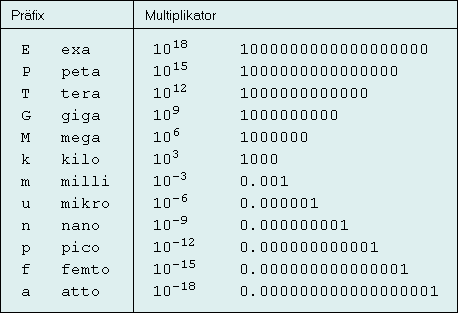 Da die möglichen Werte von vielen Bauteilen über mehrere Dekaden verteilt sein können, bedient man sich zur Bezeichnung von Werten, die mehr als einen Faktor von 1000 von der Grundeinheit abweichen, griechischer Präfixe. Das Präfix wird der Abkürzung der Maßeinheit vorangestellt und stellt einen Multiplikator dar.