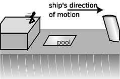 Physical effects relate only to a change in velocityConsider two statements of a kind that was at one time made with the utmost seriousness: People like Galileo and Copernicus who say the earth is rotating must be crazy. We know the earth can't be moving. Why, if the earth was really turning once every day, then our whole city would have to be moving hundreds of leagues in an hour. That's impossible! Buildings would shake on their foundations. Gale-force winds would knock us over. Trees would fall down. The Mediterranean would come sweeping across the east coasts of Spain and Italy. And furthermore, what force would be making the world turn? All this talk of passenger trains moving at forty miles an hour is sheer hogwash! At that speed, the air in a passenger compartment would all be forced against the back wall. People in the front of the car would suffocate, and people at the back would die because in such concentrated air, they wouldn't be able to expel a breath. Some of the effects predicted in the first quote are clearly just based on a lack of experience with rapid motion that is smooth and free of vibration. But there is a deeper principle involved. In each case, the speaker is assuming that the mere fact of motion must have dramatic physical effects. More subtly, they also believe that a force is needed to keep an object in motion: the first person thinks a force would be needed to maintain the earth's rotation, and the second apparently thinks of the rear wall as pushing on the air to keep it moving. Common modern knowledge and experience tell us that these people's predictions must have somehow been based on incorrect reasoning, but it is not immediately obvious where the fundamental flaw lies. It's one of those things a four-year-old could infuriate you by demanding a clear explanation of. One way of getting at the fundamental principle involved is to consider how the modern concept of the universe differs from the popular conception at the time of the Italian Renaissance. To us, the word "earth" implies a planet, one of the nine planets of our solar system, a small ball of rock and dirt that is of no significance to anyone in the universe except for members of our species, who happen to live on it. To Galileo's contemporaries, however, the earth was the biggest, most solid, most important thing in all of creation, not to be compared with the wandering lights in the sky known as planets. To us, the earth is just another object, and when we talk loosely about "how fast" an object such as a car "is going," we really mean the carobject's velocity relative to the earth-object.