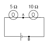 In the figure, the battery is 9 V. (a) What are the voltage differences across each light bulb? (b) What current flows through each of the three components of the circuit? (c) If a new wire is added to connect points A and B, how will the appearances of the bulbs change? What will be the new voltages and currents? (d) Suppose no wire is connected from A to B, but the two bulbs are switched. How will the results compare with the results from the original setup as drawn?