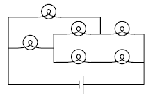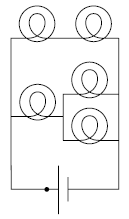 | 14 | The lightbulbs in the figure above (problem 13)are all identical. If you were inserting an ammeter at various places in the circuit, how many unique currents could you measure? If you know that the current measurement will give the same number in more than one place, only count that as one unique current.