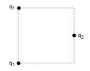 Three charges are arranged on a square as shown. All three charges are positive. What value of q2/q1 will produce zero electric field at the center of the square? | S |