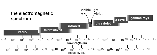 The electromagnetic spectrumToday, electromagnetic waves with frequencies in the range employed by Hertz are known as radio waves. Any remaining doubts that the "Hert zian waves," as they were then called, were the same type of wave as light waves were soon dispelled by experiments in the whole range of frequencies in between, as well as the frequencies outside that range. In analogy to the spectrum of visible light, we speak of the entire electromagnetic spectrum, of which the visible spectrum is one segment. The terminology for the various parts of the spectrum is worth memo rizing, and is most easily learned by recognizing the logical relationships between the wavelengths and the properties of the waves with which you are already familiar. Radio waves have wavelengths that are comparable to the size of a radio antenna, i.e. meters to tens of meters. Microwaves were named that because they have much shorter wavelengths than radio waves; when food heats unevenly in a microwave oven, the small distances between neighboring hot and cold spots is half of one wavelength of the standing wave the oven creates. The infrared, visible, and ultraviolet obviously have much shorter wavelengths, because otherwise the wave nature of light would have been as obvious to humans as the wave nature of ocean waves. To remember that ultraviolet, x-rays, and gamma rays all lie on the short- wavelength side of visible, recall that all three of these can cause cancer. (As we'll discuss later in the course, there is a basic physical reason why the cancer-causing disruption of DNA can only be caused by very short- wavelength electromagnetic waves. Contrary to popular belief, microwaves cannot cause cancer, which is why we have microwave ovens and not x-ray ovens!)