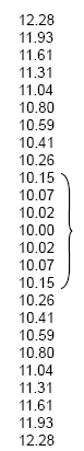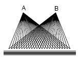 In sections 1.5 and 4.4, we saw how in the ray model of light, both refraction and reflection can be described in an elegant and beautiful way by a single principle, the principle of least time. We can now justify the principle of least time based on the wave model of light. Consider an example involving reflection, (a). Starting at point A, Huygens' principle for waves tells us that we can think of the wave as spreading out in all directions. Suppose we imagine all the possible ways that a ray could travel from A to B. We show this by drawing 25 possible paths, of which the central one is the shortest. Since the principle of least time connects the wave model to the ray model, we should expect to get the most accurate results when the wavelength is much shorter than the distances involved - for the sake of this numerical example, let's say that a wavelength is 1/10 of the shortest reflected path from A to B. The table, (b), shows the distances traveled by the 25 rays.