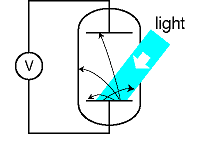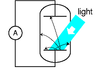 Figure e shows a practical method for detecting the photoelectric effect. Two very clean parallel metal plates (the electrodes of a capacitor) are sealed inside a vacuum tube, and only one plate is exposed to light. Because there is a good vacuum between the plates, any ejected electron that happens to be headed in the right direction will almost certainly reach the other capacitor plate without colliding with any air molecules. The illuminated (bottom) plate is left with a net positive charge, and the unilluminated (top) plate acquires a negative charge from the electrons deposited on it. There is thus an electric field between the plates, and it is because of this field that the electrons' paths are curved, as shown in the diagram. However, since vacuum is a good insulator, any electrons that reach the top plate are prevented from responding to the electrical attraction by jumping back across the gap. Instead they are forced to make their way around the circuit, passing through an ammeter. The ammeter measures the strength of the photoelectric effect.