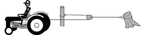Farmer Bill says this pulley arrangement doubles the force of his tractor. Is he just a dumb hayseed, or does he know what he's doing? To use Newton's first law, we need to pick an object and consider the sum of the forces on it. Since our goal is to relate the tension in the part of the cable attached to the stump to the tension in the part attached to the tractor, we should pick an object to which both those cables are attached, i.e., the pulley itself. As discussed in section 5.4, the tension in a string or cable remains approximately constant as it passes around a pulley, provided that there is not too much friction. There are therefore two leftward forces acting on the pulley, each equal to the force exerted by the tractor. Since the acceleration of the pulley is essentially zero, the forces on it must be canceling out, so the rightward force of the pulley-stump cable on the pulley must be double the force exerted by the tractor. Yes, Farmer Bill knows what he's talking about.
