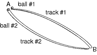 The figure shows two ramps which two balls will roll down. Compare their final speeds, when they reach point B. Assume friction is negligible.