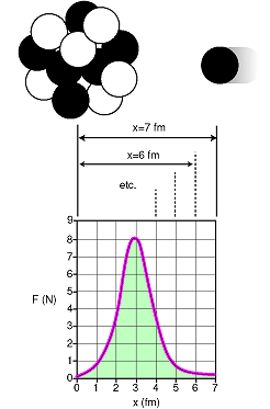 The graph shows the force between the carbon nucleus and the proton as the proton is on its way in, with the distance in units of femtometers (1 fm=10-15 m). Amusingly, the force turns out to be a few newtons: on the same order of magnitude as the forces we encounter ordinarily on the human scale. Keep in mind, however, that a force this big exerted on a single subatomic particle such as a proton will produce a truly fantastic acceleration (on the order of 1027 m/s2!). Why does the force have a peak around x = 3 fm, and become smaller once the proton has actually merged with the nucleus? At x = 3 fm, the proton is at the edge of the crowd of protons and neutrons. It feels many attractive forces from the left, and none from the right. The forces add up to a large value. However if it later finds itself at the center of the nucleus, x = 0, there are forces pulling it from all directions, and these force vectors cancel out. We can now calculate the energy released in this reaction by using the area under the graph to determine the amount of mechanical work done by the carbon nucleus on the proton. (For simplicity, we assume that the proton came in aimed at the center of the nucleus, and we ignore the fact that it has to shove some neutrons and protons out of the way in order to get there.) The area under the curve is about 17 squares, and the work represented by each square is (1 N)(10-15 m) = 10-15 J , so the total energy released is about (10-15 J/square)(17 squares) = 1.7 × 10-14 J . This may not seem like much, but remember that this is only a reaction between the nuclei of two out of the zillions of atoms in the sun. For comparison, a typical chemical reaction between two atoms might transform on the order of 10-19 J of electrical potential energy into heat - 100,000 times less energy! As a final note, you may wonder why reactions such as these only occur in the sun. The reason is that there is a repulsive electrical force between nuclei. When two nuclei are close together, the electrical forces are typically about a million times weaker than the nuclear forces, but the nuclear forces fall off much more quickly with distance than the electrical forces, so the electrical force is the dominant one at longer ranges. The sun is a very hot gas, so the random motion of its atoms is extremely rapid, and a collision between two atoms is sometimes violent enough to overcome this initial electrical repulsion.