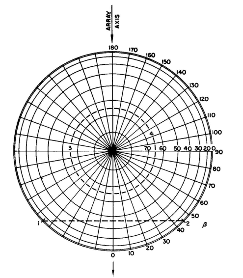 Now consider the dotted circle 3-4 at 65 degrees above the horizon in all directions. This is the null circle for the 190-degree vertical radiator. The only null in the vertical plane for a radiator less than 180 degrees high is at 90 degrees (zenith). This example points the way to a rapid solution for the null angles in the three-dimensional pattern for any linear array of identical vertical radiators. An orthographic projection of the hemisphere is drawn, placing a pole at the zenith and laying out the angles β from the axis of the array from zero to 180 degrees each way. The latitude ( α ) lines are laid out orthographically by drawing circles through points that divide the radius in proportion to cos a, as in Fig. 2.38. With the hemispherical coordinates prepared in this way, place points on the periphery at the angles that correspond to null angles in the horizontal pattern for the array, symmetrically, and draw chords across the chart to connect corresponding nulls on each side of the axis. Then draw circles from the center at any vertical angle for a null in the vertical pattern for the radiator to be used, if there is one. From these the location of the nulls in all other vertical planes can be read directly from the diagram thus prepared. From a diagram of this type one can form a mental picture of the vertical pattern at any azimuth when the horizontal pattern for the array and the vertical pattern for a single radiator are known. It will be recalled that in the direction broadside to the array the vertical pattern for the array will be identical to a single radiator. When the array consists only of two vertical radiators, the null zones in the three-dimensional pattern occur wherever