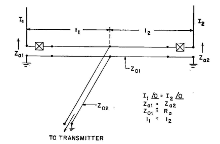 The feeder system for a two-element cophased array with equal currents can be very simple, because the electrical symmetry of impedances and power division permits the system to be energized by a symmetrical feeder system. Figure 2.39 shows the simplest arrangement of a symmetrical feeder system for such an array. The equality of antenna impedances makes it necessary only to apply equal cophased potentials at each radiator base. This can be done by providing identical distances from the transmitter to each radiator.