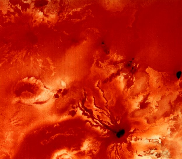 Image of possible volcanic calderas on Jupiter's moon Io. The caldera may be venting gasses, seen as the light patch at left center in this picture. The dark areas on the caldera floor are thought to be molten sulfur. The image was taken as Voyager 1 approached Io at a distance of about 130,000 km. (Voyager 1, P-21286)