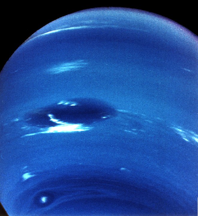 Voyager 2 image of Neptune showing the Great Dark Spot and associated bright clouds and a bright Scooter to the lower left. Below the Scooter can be seen a smaller dark spot with a bright core. All the features are moving to the east at different speeds with the strong global winds. This image was produced with the orange, green, and clear filters. The Great Dark Spot is about 6,000 km from top to bottom. North is at 12:30 (Voyager 2, P-34632)