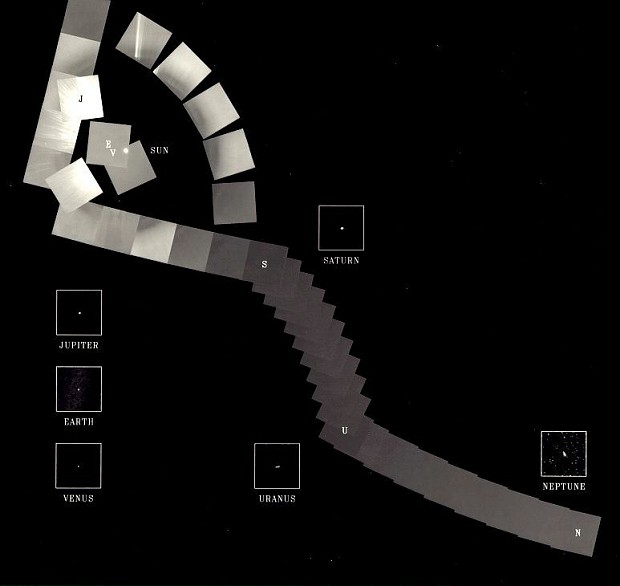 The cameras of Voyager 1 on Feb. 14, 1990, pointed back toward the sun and took a series of pictures of the sun and the planets, making the first ever "portrait" of our solar system as seen from the outside. In the course of taking this mosaic consisting of a total of 60 frames, Voyager 1 made several images of the inner solar system from a distance of approximately 4 billion miles and about 32 deqrees above the ecliptic plane. Thirty-nine wide angle frames link together six of the planets of our solar system in this mosaic. Outermost Neptune is 30 times further from the sun than Earth. Our sun is seen as the bright object in the center of the circle of frames. The wide- angle image of the sun was taken with the camera's darkest filter (a methane absorption band) and the shortest possible exposure (5 thousandths of a second) to avoid saturating the camera's vidicon tube with scattered sunlight. The sun is not large as seen from Voyager, only about one-fortieth of the diameter as seen from Earth, but is still almost 8 million times brighter than the brightest star in Earth's sky, Sirius. The result of this great brightness is an image with multiple reflections from the optics in the camera. Wide-angle images surrounding the sun also show many artifacts attributable to scattered light in the optics. These were taken through the clear filter with one second exposures. The insets show the planets magnified many times. Narrow-angle images of Earth, Venus, Jupiter, Saturn, Uranus and Neptune were acquired as the spacecraft built the wide-angle mosaic. Jupiter is larger than a narrow-angle pixel and is clearly resolved, as is Saturn with its rings. Uranus and Neptune appear larger than they really are because of image smear due to spacecraft motion during the long (15 second) exposures. From Voyager's great distance Earth and Venus are mere points of light, less than the size of a picture element even in the narrow-angle camera. Earth was a crescent only 0.12 pixel in size. Coincidentally, Earth lies right in the center of one of the scattered light rays resulting from taking the image so close to the sun.