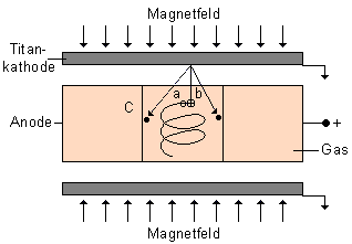 1. Durch Verdampfen Das Gettermaterial (meist Barium oder Titan) wird durch einen Glühdraht oder durch einen Hochfrequenzofen erhitzt und verdampft. Dabei schlägt es sich an den Wänden der Pumpe als Spiegel nieder und erzeugt so eine sich permanent erneuernde Oberfläche. 2. Durch Kathodenzerstäubung Die Ionenzerstäuberpumpe besteht aus 2 massiven Titankathoden und einer zwischen ihnen liegenden wabenähnlichen Anode A, an die eine elektrische Gleichspannung von einigen tausend Volt gelegt wird. Zusätzlich wird die Anordnung von einem konstanten starken Magnetfeld durchsetzt, dessen Feldlinien senkrecht auf die Kathoden stehen. Die hohe Spannung erzeugt eine Gasentladung, die zur Erosion der Titankathoden führt. Das Titan schlägt sich dann auf der Anode und im restlichen Pumpenraum nieder und erzeugt dadurch die notwendigen "frischen" Getterflächen.